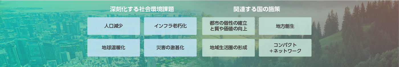 人口減少・地球温暖化の進展・災害の激甚化・インフラ老朽化、都心一極集中および地方の人手不足など、我々を取り巻く社会環境課題は益々深刻になっています。このような状況に対して、国・政府では、「都市の個性の確立と質や価値の向上」(国土交通省)、「地方創生2.0」(内閣府)等を切り口として、成熟社会における地域固有の魅力に着目した都市再生や地方創生の議論が進められています。