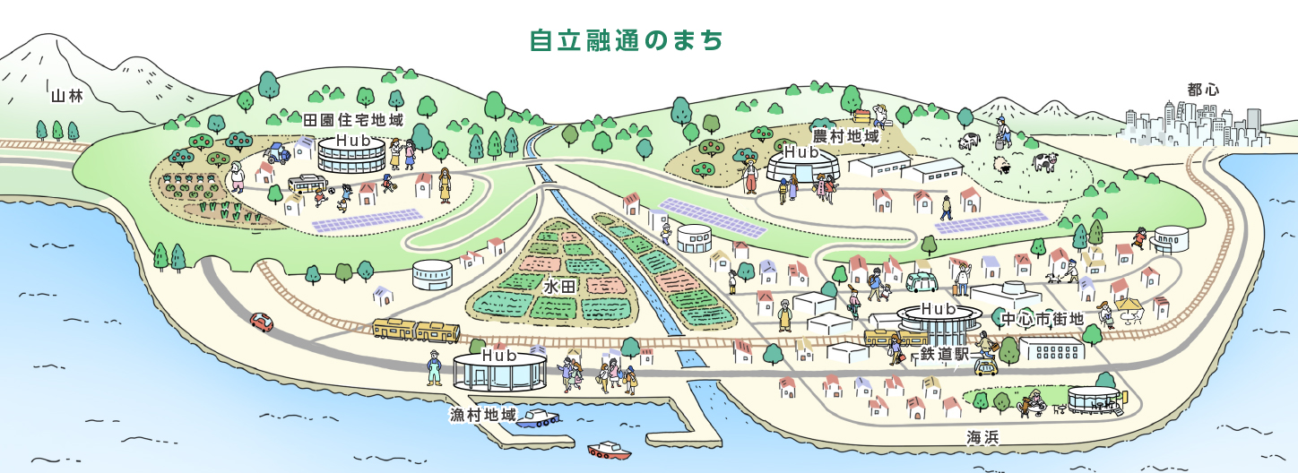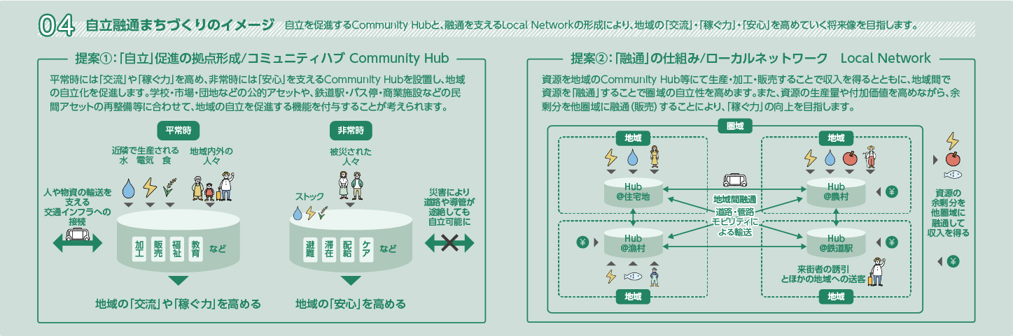 地域における「自立」と「融通」を高めていく「自立融通まちづくり」を提案します。