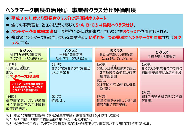 ベンチマーク制度の目指すべき指標は各業界での上位事業者1~2割が満たす水準とされており、事業者によっては高いハードルとなる場合があるかもしれません。また、指標は相対的なものなので、数年ごとに見直しが行われる可能性もありますが、平成28年度より開始した事業者クラス分け評価制度のSランク水準に「ベンチマーク目標達成」が加えられていることからも、事業者が目指すべき指標として大きな意義があるのではないかと思います。