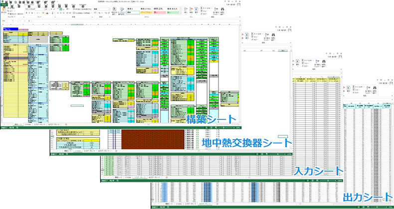 上記を背景として、NSRIでは、再生可能エネルギー熱の中で特に、地中熱利用システムに着目し、地中熱利用システムを含む空調熱源シミュレーションツールの開発を行っています。本開発ツールは、設計建物に採用される地中熱ヒートポンプやその他の熱源を含む全ての空調熱源システムの計算ができるツールとし、年間を通しての運転状況やエネルギー消費量を計算できるトータルシミュレーションツールを目指しています。本開発ツールを用いることにより、設計者が簡易に地中熱ヒートポンプ導入時のエネルギー消費量の計算を行うことができるため、地中熱ヒートポンプを導入検討・採用する建物数が増加することが期待されます。年間システムシミュレーションによる最適な機器容量の算定で、過大な設備容量の機器の導入が抑制され、イニシャルコストの削減が可能と考えられます。本開発ツールを、最適な運転条件を指示できるツールとし、運用時のガイドとすることで運用時のランニングコストの削減を図ります。