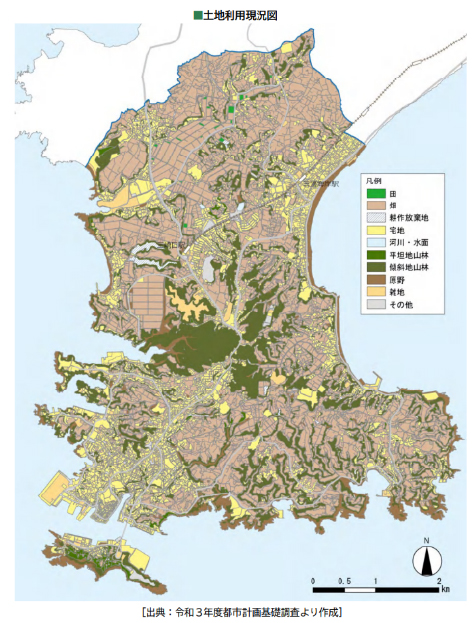 三浦市の土地利用を見ると、宅地面積率は約16%。市街地は鉄道駅周辺や幹線道路沿道、沿岸集落などにコンパクトに集積しています。一方、耕地面積率は約37%(全国平均11%)と高く、農業用の土地資源が非常に豊かな地域です。ただし、生産物は野菜が中心であり、高カロリーな穀物や畜産物は限られています。また、農地開拓の影響で山林面積率は約18%(全国平均約66%)にとどまり、上水は市外の相模川から引水しています。こうした状況から、食や水の観点で自立性を高めるためには、水源となる山林の育成や農業生産物の転換など、長期的な視点での取り組みが必要と考えられます。