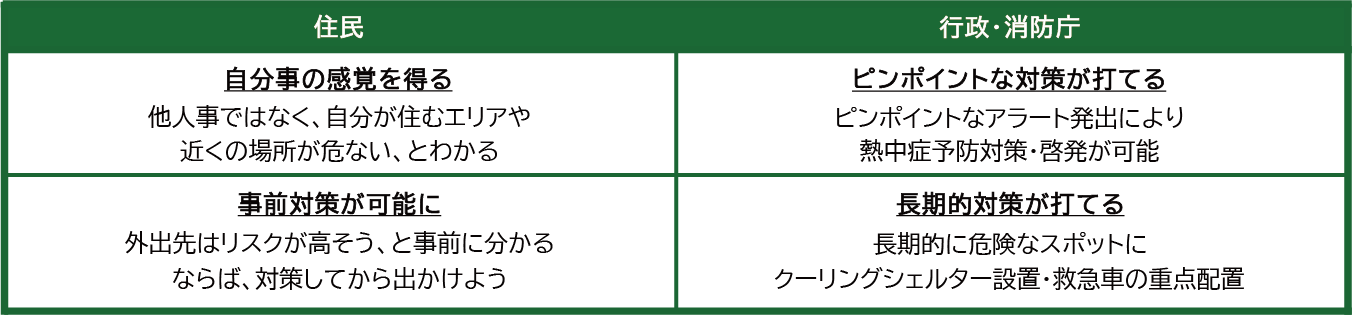 「熱中症キケンファインダー」を活用することで、住民・行政の双方に次のような効果が想定されます。