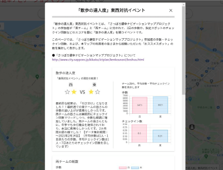 本業務は、ゲーミフィケーションと情報提示(ダッシュボードの構築・公開)による、人々の行動変容の効果を検証するものです。具体的には、連携企業・札幌市と協働し、歩数やチェックイン(特定地点への来訪)回数をチーム対抗戦として競うイベントを実施するとともに、おススメルート・スポットやリアルタイム混雑度を表示するダッシュボードを構築し、イベント参加者の歩数や移動パターンの変化を評価しました。