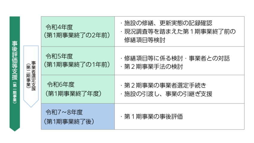 - 第1期PFI事業の成果と課題を整理し、事業の評価を行いました。